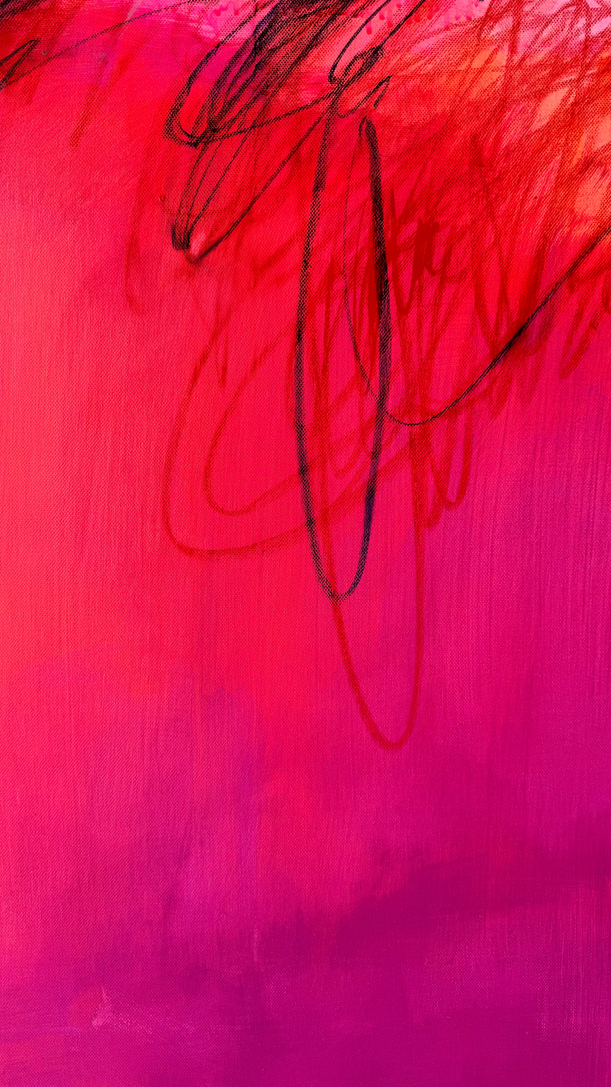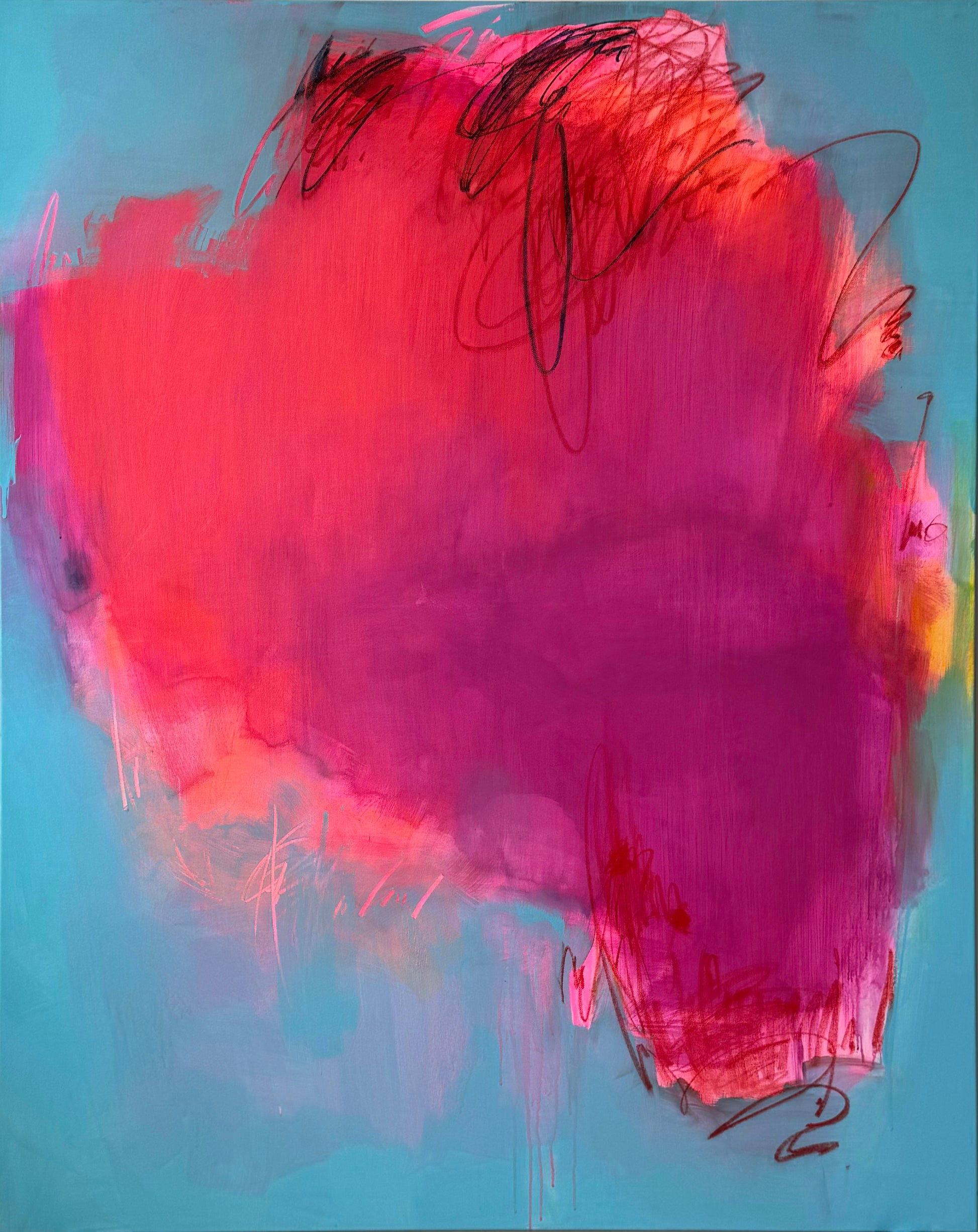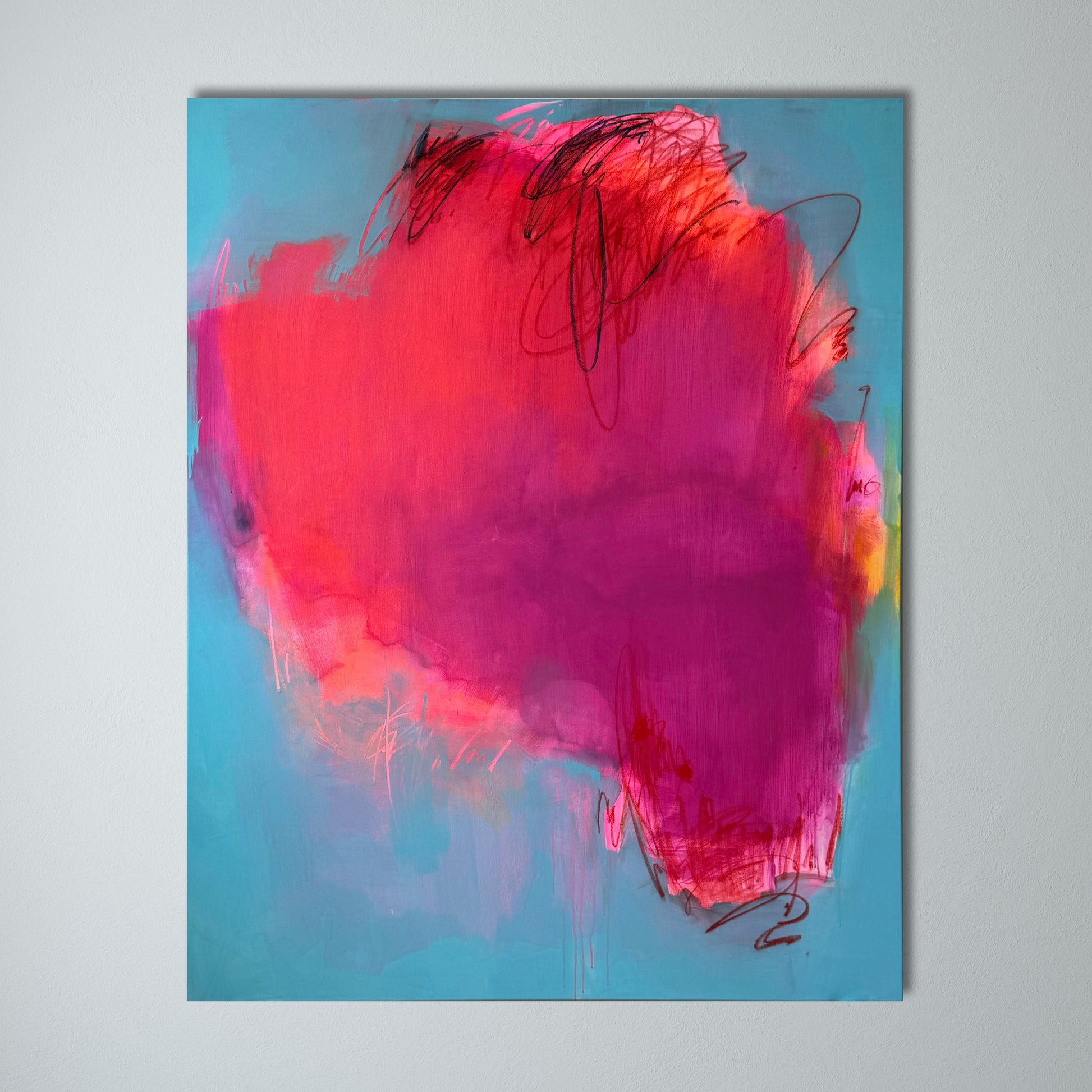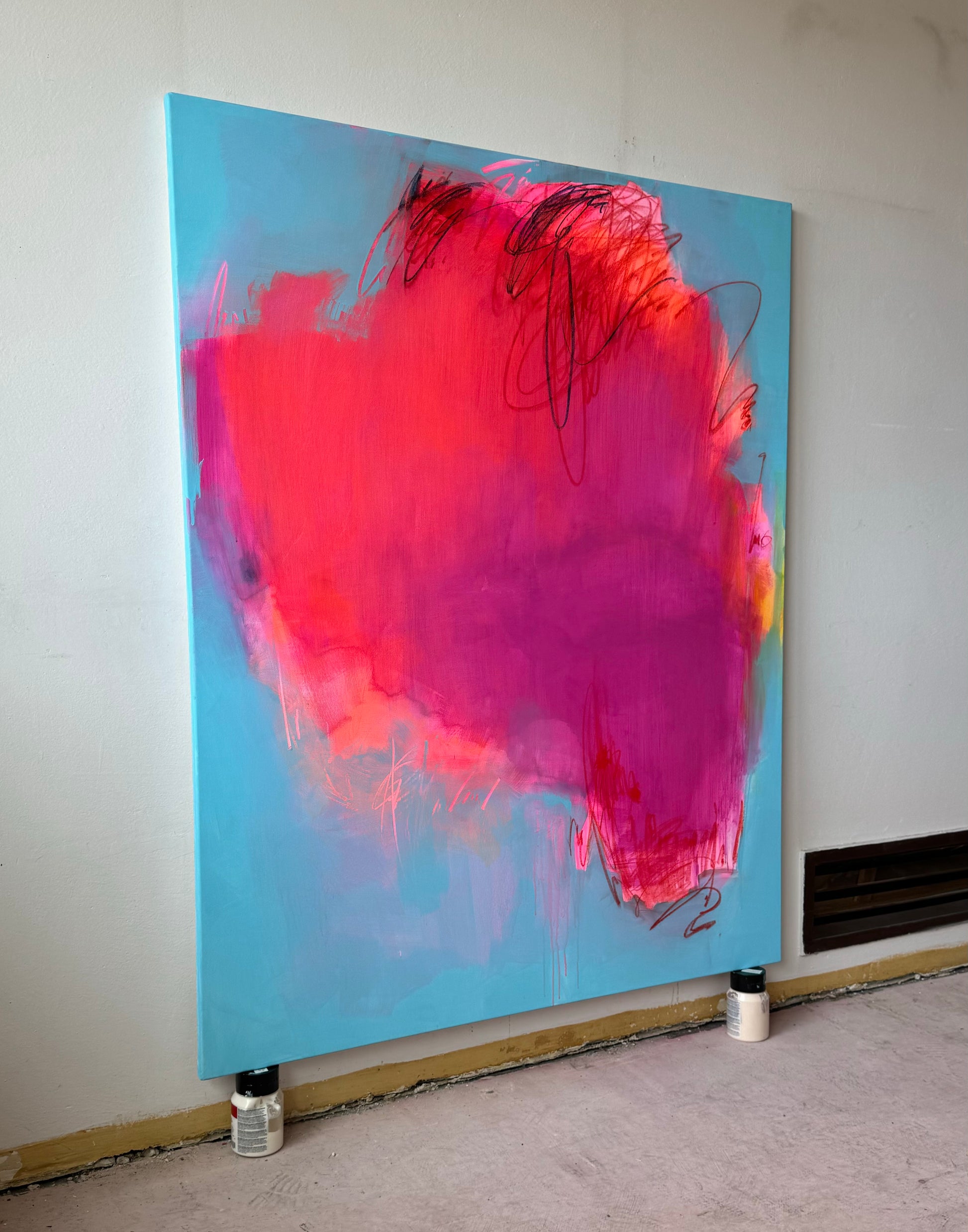 This captivating large abstract painting features a dynamic neon pink center that pulses with vibrant energy against a serene light blue background. Thin, intricate lines weave through the composition, adding depth and movement, creating a striking contrast between the bold central hue and the tranquil backdrop.