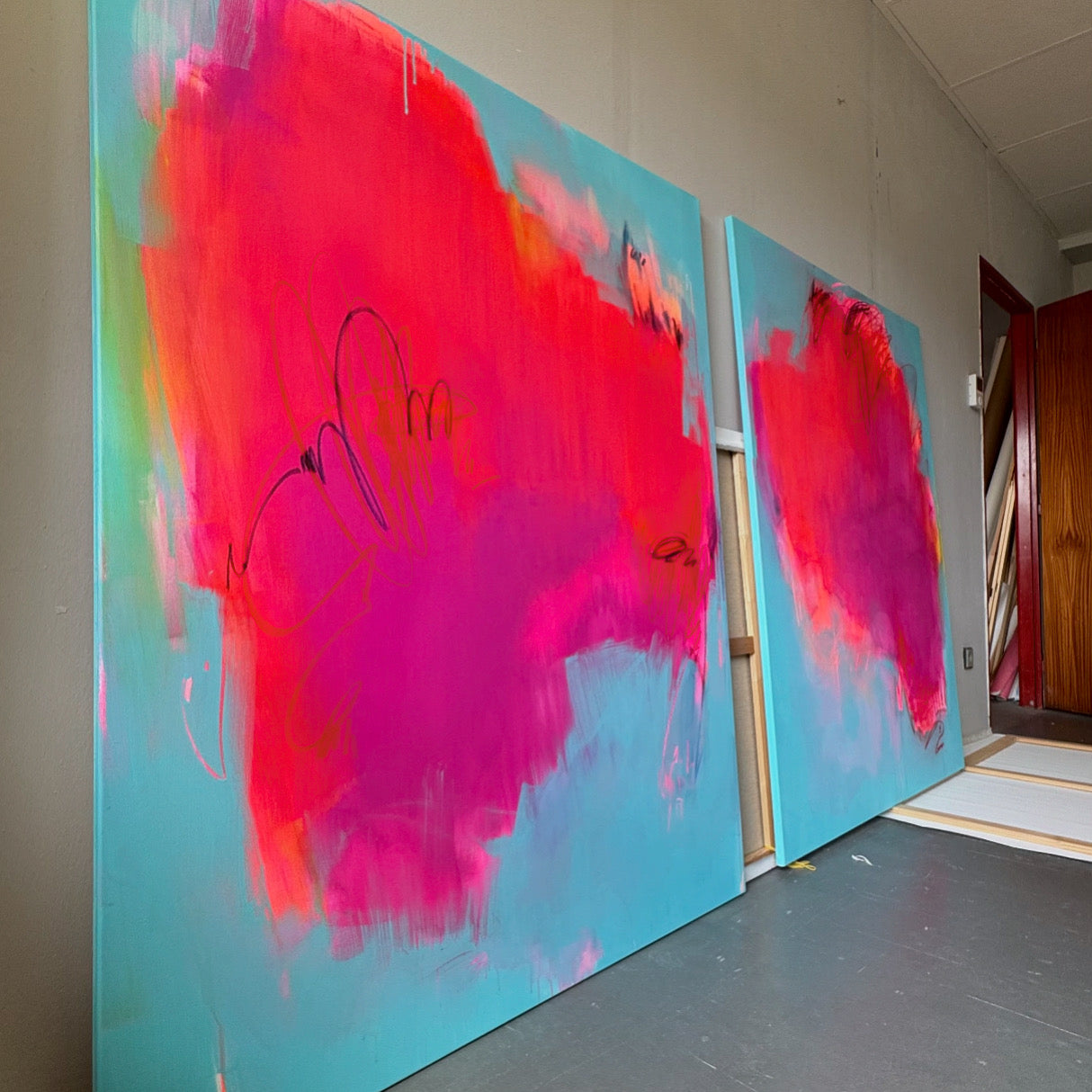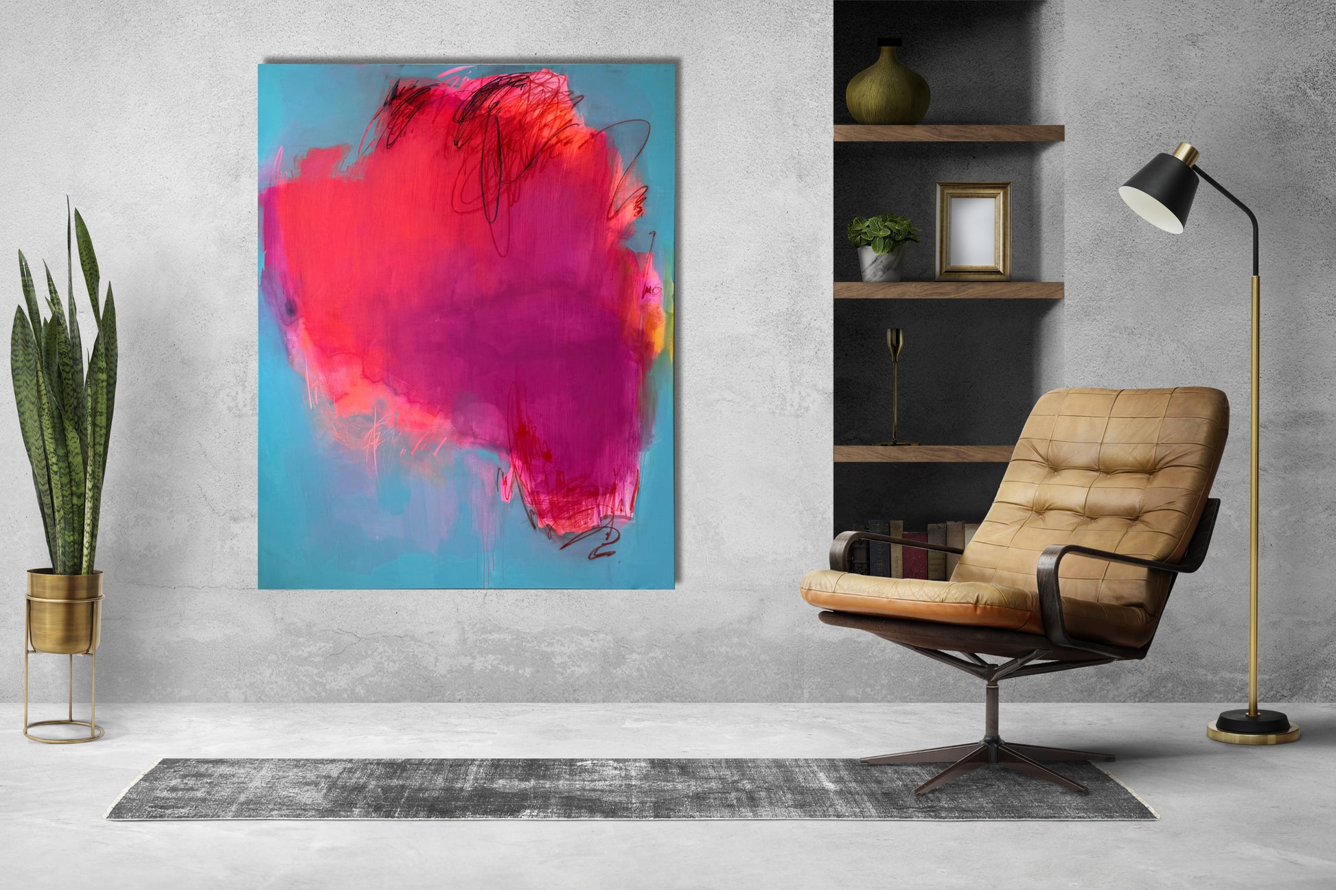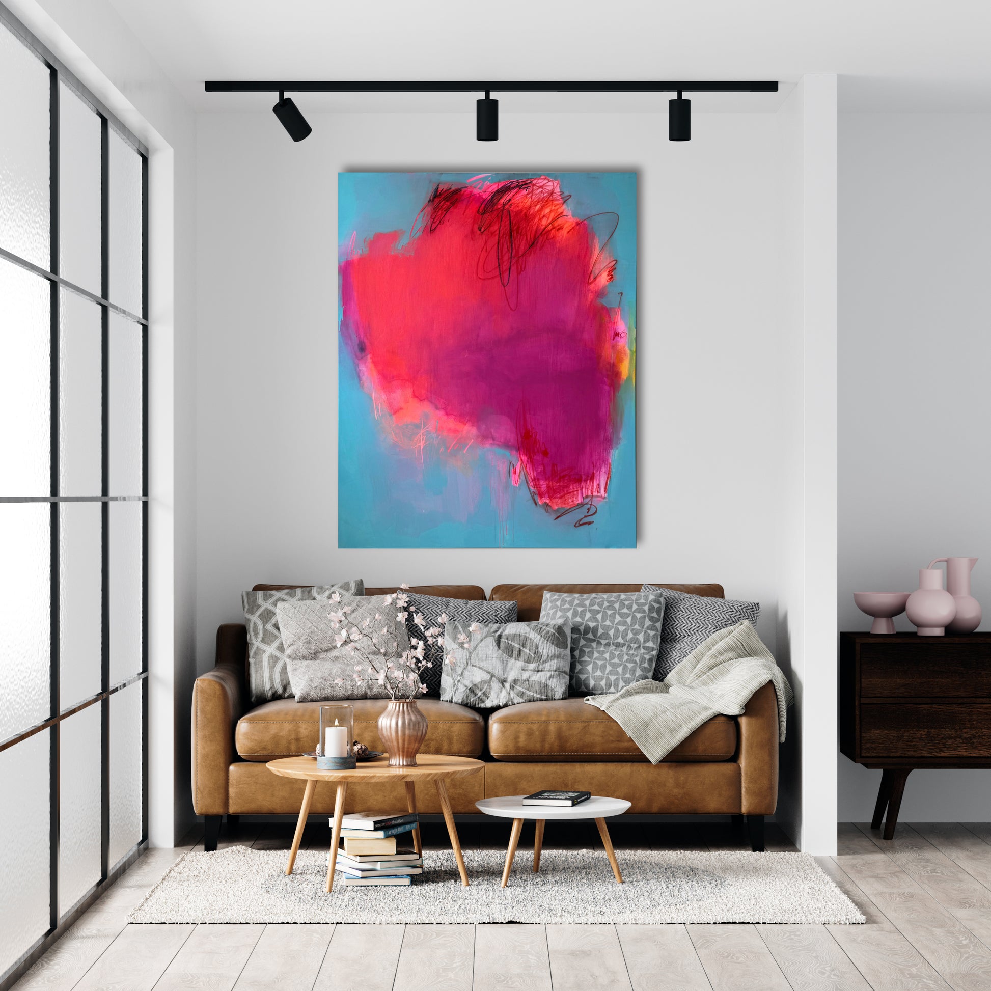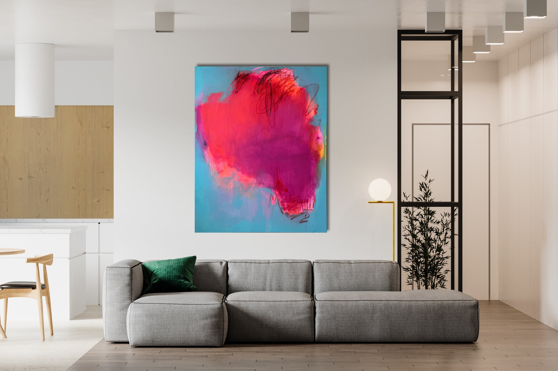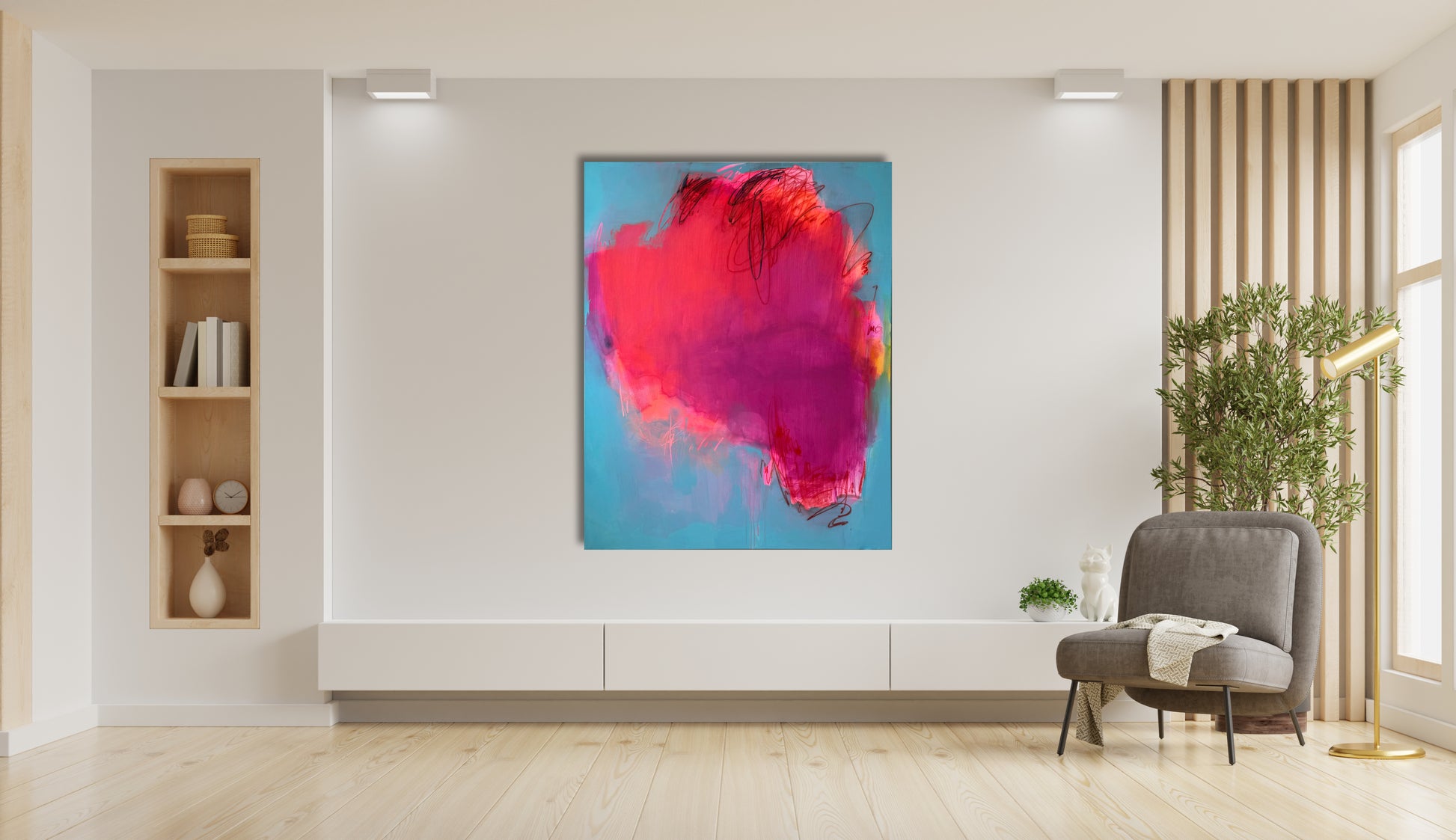 This captivating large abstract painting features a dynamic neon pink center that pulses with vibrant energy against a serene light blue background. Thin, intricate lines weave through the composition, adding depth and movement, creating a striking contrast between the bold central hue and the tranquil backdrop.