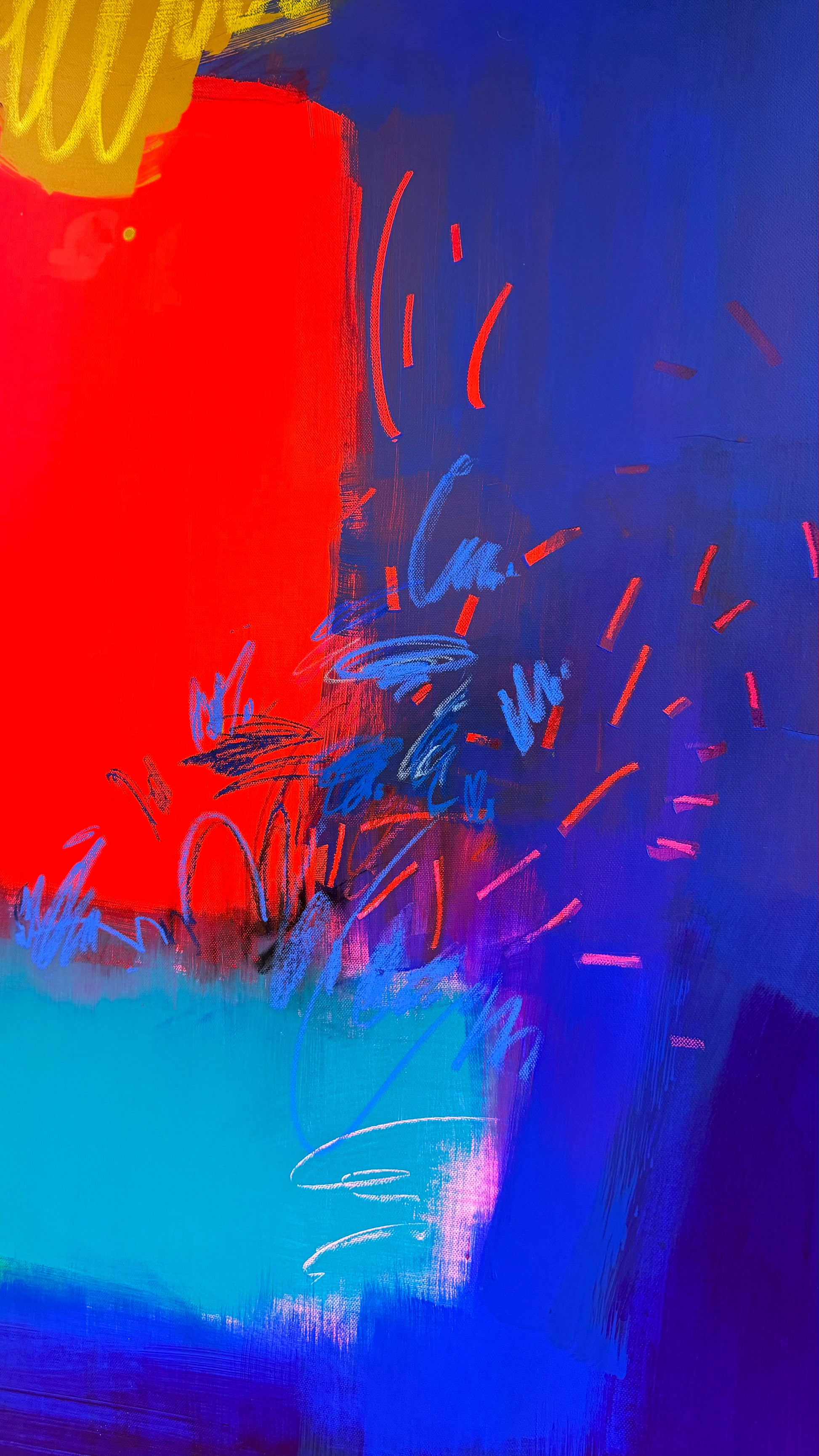 Set against a deep blue background, the composition is enriched with vibrant hues and intricate, subtle lines, creating a dynamic interplay of color and texture that evokes the complexity of the human experience.