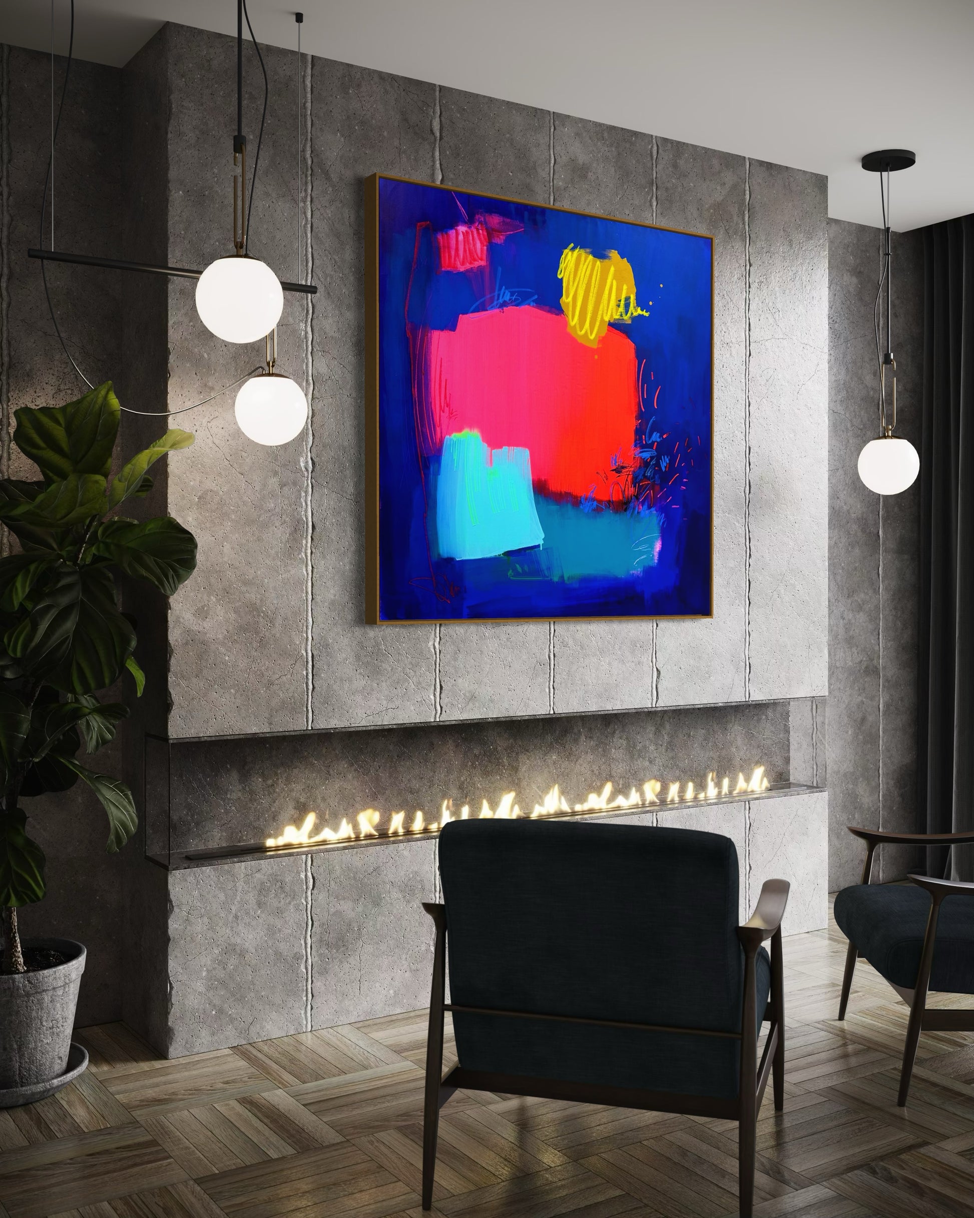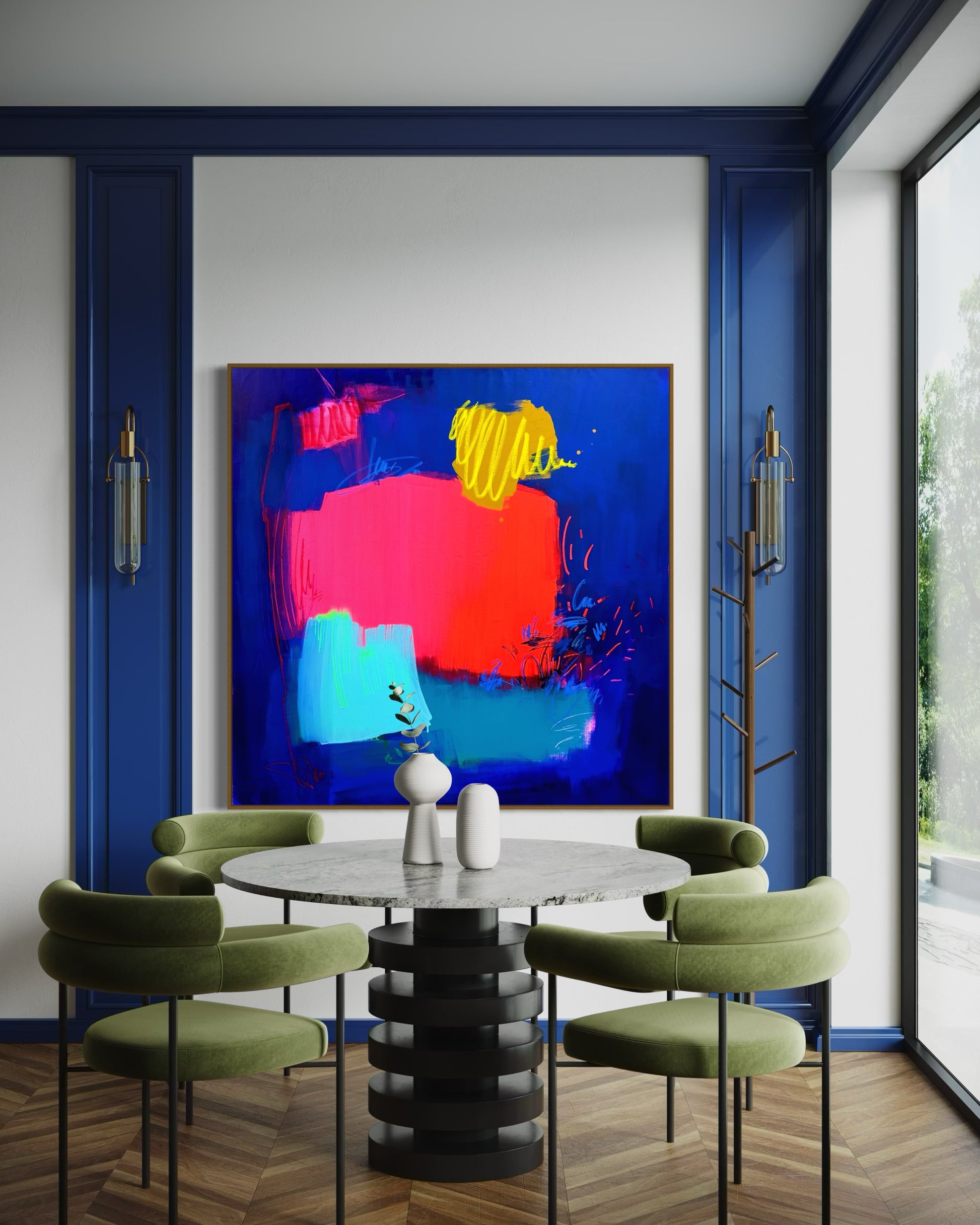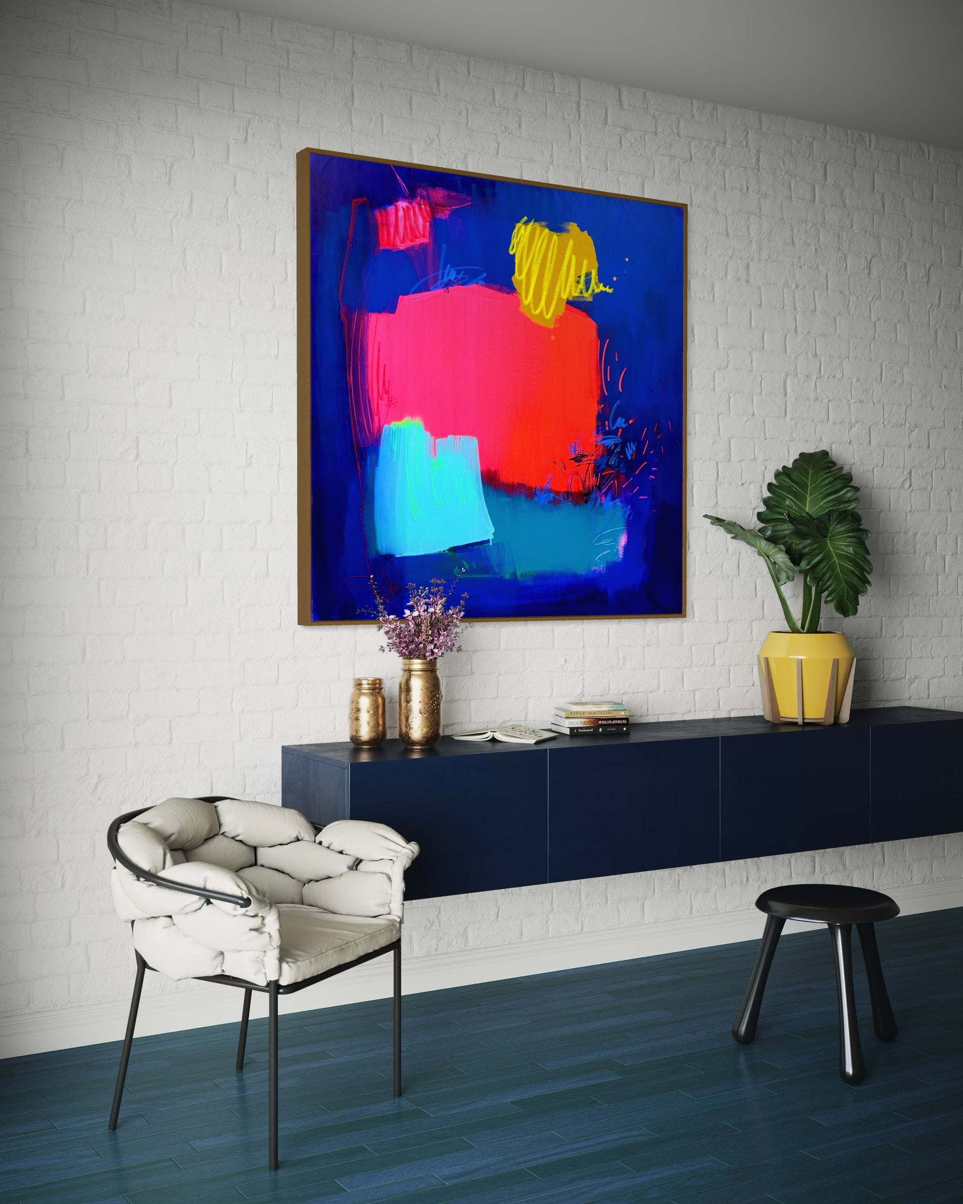 This abstract painting features a bold, bright red spot at its center, symbolizing an intense emotion captured in a fleeting moment.
